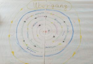 Die Mitte spiegelte ebenso ihr Konzept wider wie das vorbereitete Plakat „Übergang“.  In die Spirale – Sinnbild des Lebens als sich stetig wandelnder Prozess – konnten die Tänzerinnen ihre Gedanken, Assoziationen, Wünsche eintragen (siehe Fotos). Den Tag beschloss Barbara mit einem Ritual, das die wichtigsten Tanz-Ideen noch einmal aufgriff und zusammenfügte.